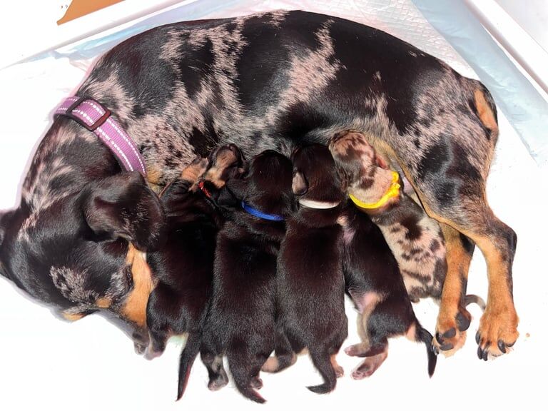 Our beautiful girl has given birth to 4 adorable Puppies Mum is a Silver Dapple Miniature Dachshund and Dad is a Long haired Chocolate Miniature Dachshund. Both mum and dad can be seen when the Puppies are viewed. I’m more than happy to send picture updates, video calls. Looking for the perfect little companion? Our adorable Miniature Dachshunds are ready to melt your heart!