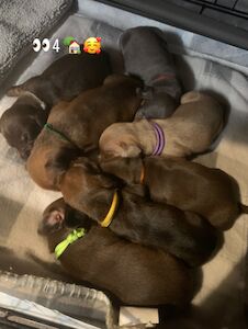 All now sold  My KC REG PRA CLEAR girl,  Lottie has had 6 beautiful Puppies.  3 choc and tan girls  Lottie is a lovely natured, KC REG miniature Dachshund with a championship bloodline and the stud dog is my daughter’s KC REG boy who again has championship bloodline. They are PRA CLEAR All Puppies will be wormed, vet checked , KC registered and