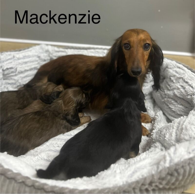 !ONLY ONE AVAILABLE!  & now sadly ready to leave!  Here we have three gorgeous miniature long haired Dachshund Puppies.  We are searching for 5* homes for our outstanding family reared babies.  Mum our family pet has done an amazing job bringing up her beautiful babies! She has a lovely temperament, very loving and loyal.  Dad was a stud but he was